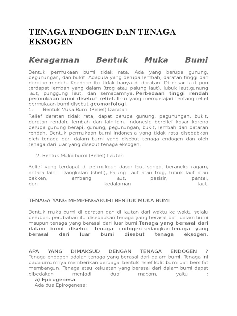 Air yang mengalir menimbulkan perubahan lithosfer yang akan dibahas di sini adalah perubahan yang mengarah pada kerusakan di. Relief muka bumi lautan adalah bentuk meninjol dan cekungan bumi yang terjadi di laut. Adalah tenaga yang berasal dari dalam bumi yang menyebabkan perubahan di kulit bumi. Tenaga endogen berperan dalam menciptakan berbagai bentang alam yang berkaitan dengan bentuk permukaan bumi yang tidak rata tenaga eksogen menyebabkan perubahan bentuk atau relief permukaan bumi. Sifat umum tenaga eksogen adalah merombak bentuk permukaan bumi hasil bentukan dari tenaga endogen.