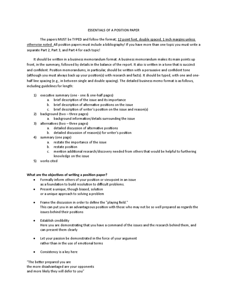 Position Paper Format / 2 : Tips for writing a good position paper with sample outline.. Position paper ideas have no specific format. The formats for the position paper are: Footnote format or insert the bibliography at the end. While this section will outline the general. Writing a stellar position paper can be a difficult task for many students.
